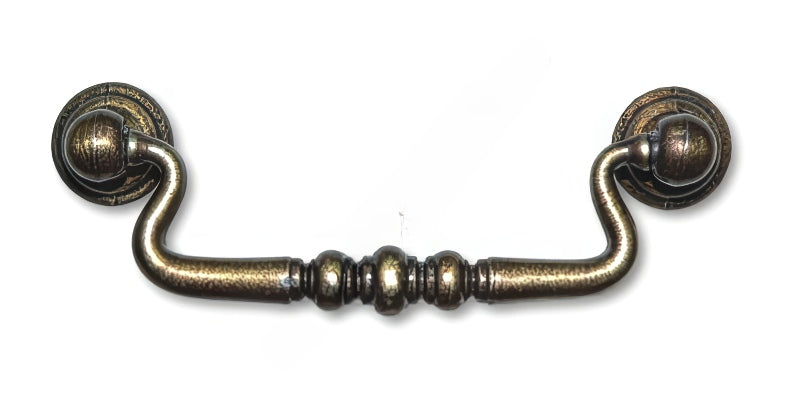 Mânerul de mobilier rustic turnat din aliaj de zinc constă dintr-un mâner ornamentat și 2 piese de montare cu găuri pentru șuruburi M4, cu finisaj din alamă antică, lungime totală de 116 mm cu 96 mm între găurile pentru montarea mânerului pe sertar și o lățime totală a mânerului. de 37 mm și o înălțime de 20 mm pe sertar.